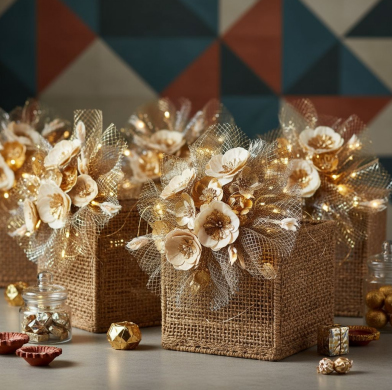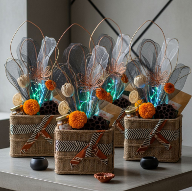 Sustainable and biodegradable materials are being used to create environmentally friendly Diwali gift hampers.